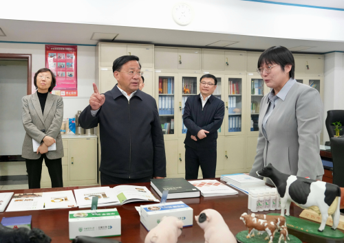 在全国畜牧总站,韩俊通过畜牧业综合信息平台了解生猪产能调控、奶牛肉牛产业发展等情况,听取畜禽育种进展、畜牧业生产转型工作汇报。他强调,要着眼保障重要农产品稳定安全供给,持续做好畜牧业生产监测分析,进一步完善生猪产能调控机制,持续抓好奶牛肉牛产业纾困,稳定基础产能。要在畜禽种业创新上下更大功夫,挖掘一批优异畜禽种质资源,加快培育一批优良畜禽品种。要加力推广低蛋白日粮技术,大力发展优质饲草产业,扎实抓好畜禽粪污综合利用,推动畜牧业集约高效绿色发展。