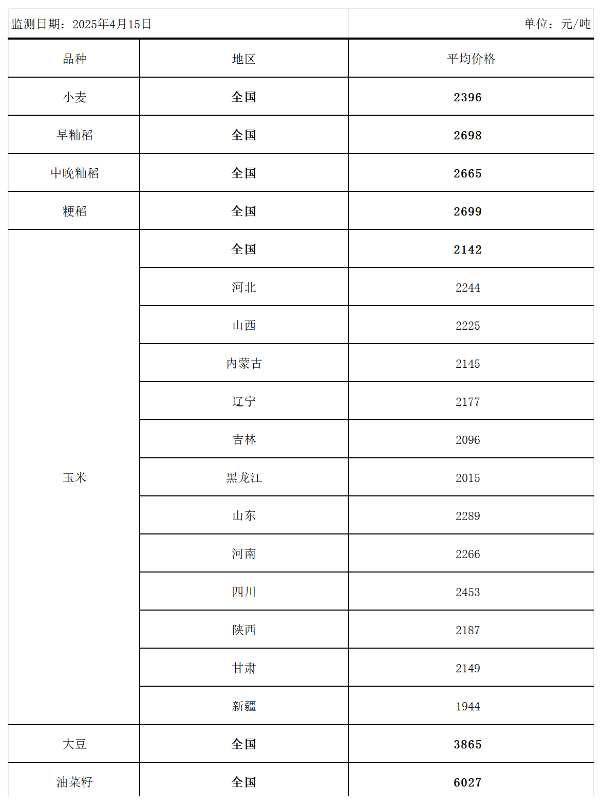 全国主要粮食品种收购价格周报(4月15日)