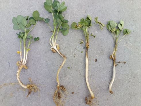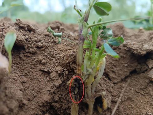 昨天收到南阳南召一个农民朋友的咨询电话,有很多春花生田块里出现大量的死苗现象。通过他反馈的图片可以发现田间花生大量枯死,经过农掌郎识别出其主要是因为花生茎腐病造成的。花生茎腐病主要是由于黏土地花生播种过深造成的。黏土地由于保水性太好,下雨后,土壤中的含水量一直很高,花生又播种过深就会造成花生的根系以及下胚轴甚至上胚轴以及第 一对侧枝都在很水量很大的土壤中浸泡着,这样非常容易感染花生茎腐病。