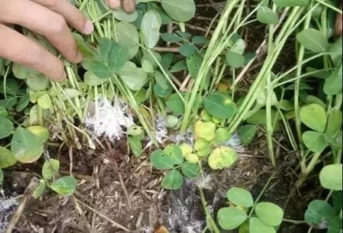 地下部分:根部腐烂,荚果表面现褐斑,内部果仁霉变;病株矮小,生长缓慢。