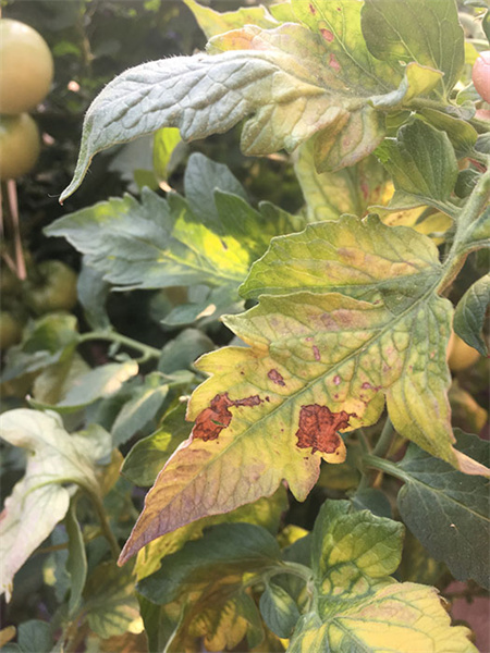 番茄疫霉根腐病,幼苗染病,先由叶染病,病叶出现水浸状暗绿色病斑,当向叶脉和茎蔓延后,可使茎变细并呈黑褐色,zui终导致植株萎蔫或倒伏,高湿条件下病部产生白色霉层;叶片染病多从叶尖、叶缘开始,初为暗绿色不规则的水浸状病斑,后转为褐色。
