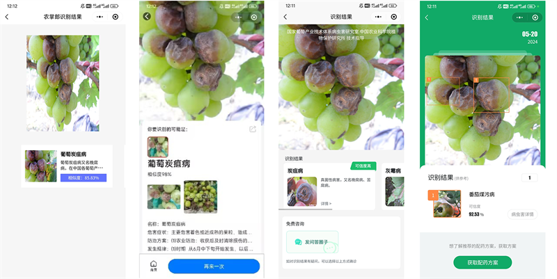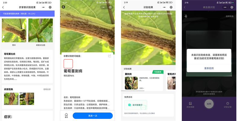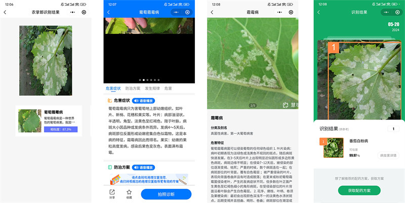 我们挑选了5款软件都有的葡萄作为测试对象。一共挑选10张照片,涉及病害名称、害虫名称、危害症状、防治方案,并且挑选了葡萄果实、叶片、茎秆进行测试。