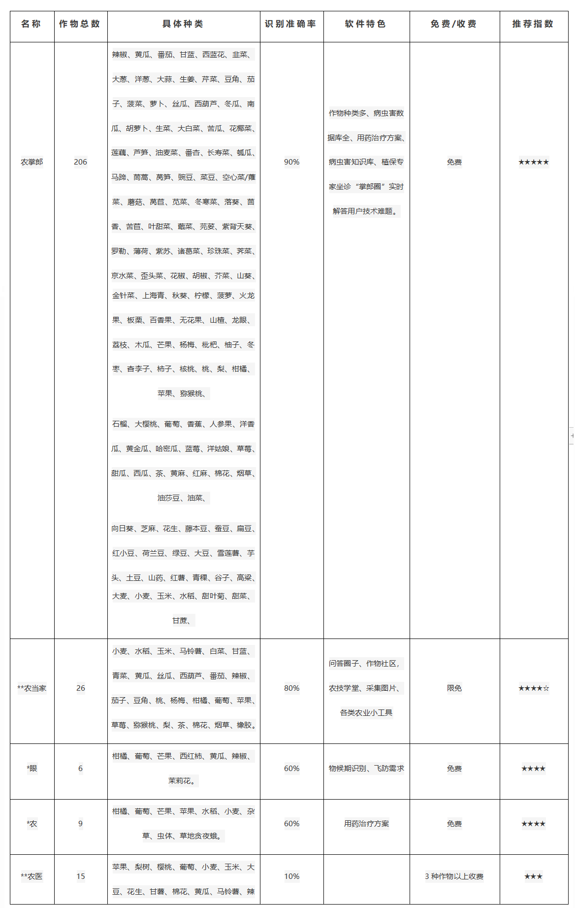 农掌郎从作物种类、识别准确率、软件特色3方面表现要优于其余软件。